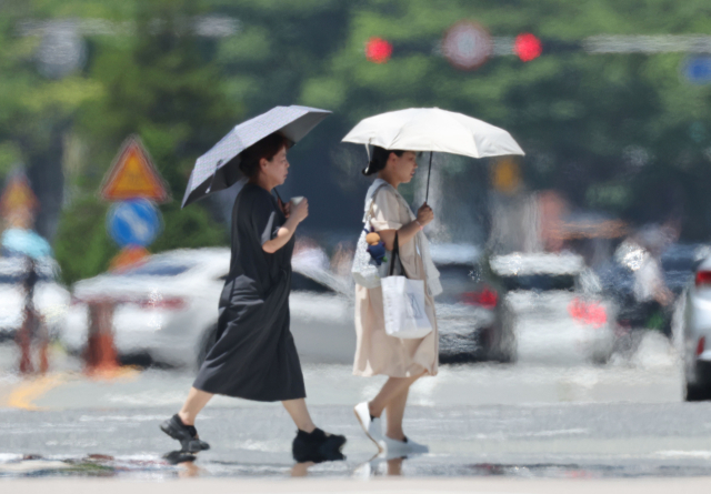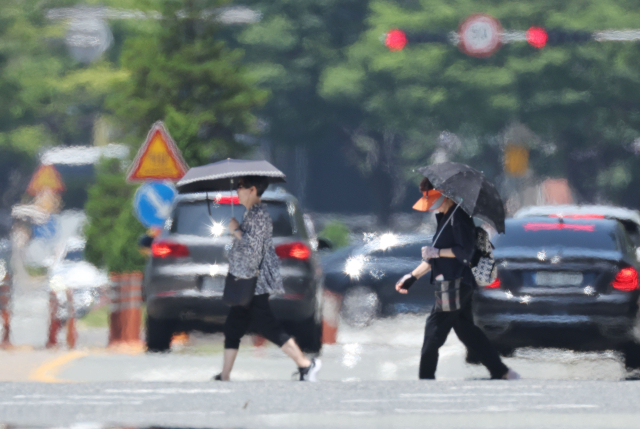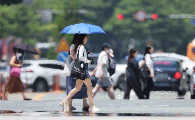 부산지역에 폭염특보가 이어진 2일 해운대구 벡스코 인근 도로에서 시민들이 지열로 아지랑이가 피어오르는 횡단보도를 건너고 있다.