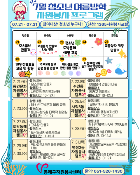 부산 동래구자원봉사센터(센터장 하소연)는 오는 7월 21일부터 7월 31일까지 11일간 여름방학을 맞은 청소년들을 대상으로 ‘2025년 여름방학 청소년 자원봉사 집중 프로그램(동래 V-페스타)’를 운영한다.