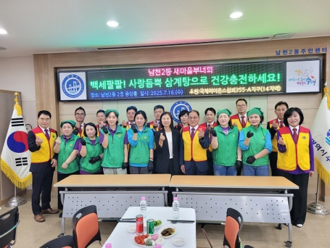 남천2동 새마을부녀회(회장 서소영)가 주최한 이 행사는 관내 저소득 어르신들을 위해 회원들이 삼계탕을 직접 끓이고 김치, 밑반찬, 떡 등을 준비하여 장마철 날씨에 기력이 없는 저소득 어르신 50여 명을 동 행정복지센터에 초청하여 식사를 대접하고, 나머지 30여 명에게는 삼계탕 밀키트를 제공하여 이웃 간의 훈훈한 정을 나누었다.