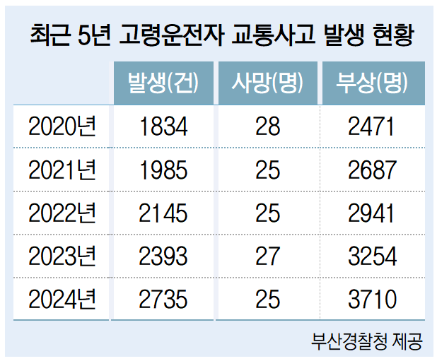 경찰이 고령운전자 면허증 반납을 장려하는 까닭은 고령운전자로 인한 사망 사고가 끊이지 않기 때문이다. 최근 5년간 부산 교통사고 사망자는 568명인데 그중 고령 운전자 교통 사고로 인한 사망자는 130명이다. 특히 지난해엔 전체 사망자 109명 중 25명이 고령 운전자로 인해 사망했고, 2023년에는 110명 중 27명이 고령 운전자 교통사고로 숨졌다. 부산 교통사고 사망자 4명 중 1명이 고령 운전자가 일으킨 교통 사고로 목숨을 잃었다.