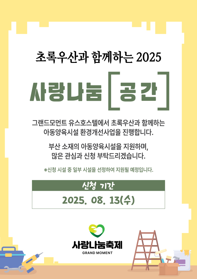 그랜드모먼트 유스호스텔(대표이사 김도환)과 초록우산 어린이재단(부울경권역총괄본부장 이수경)은 오는 8월 13일까지 부산 지역 아동양육 시설을 대상으로 한 환경개선사업 ‘2025 사랑 나눔 공간’ 신청 접수를 진행한다고 31일 밝혔다.