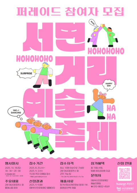 (재)부산진문화재단(이사장 김영욱 부산진구청장)은 오는 10월 17~18일에 열리는 2025 지역문화 특화사업 ‘서면거리예술축제’ 주제공연의 퍼레이드 퍼포먼스 참가팀을 모집한다고 밝혔다.