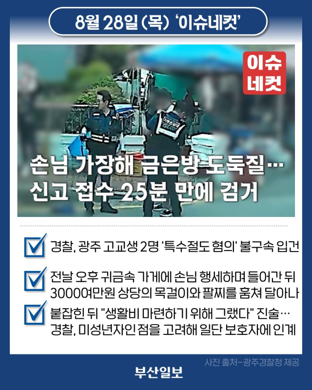 전날인 27일 광주광역시 서구의 한 금은방에서 손님 행세를 하며 귀금속을 훔쳐 달아난 10대들이 경찰의 신속한 추적으로 검거됐습니다. 경찰은 특수절도 혐의로 지역 고등학생 2명을 불구속 입건해 조사 중인데요. 서로 다른 고등학교에 다니는 이들은 손님 행세를 하며 금은방에 들어갔고, 3000여만원 상당 금목걸이와 금팔찌를 살 것처럼 착용하다가 업주의 감시가 소홀해지자 도주했습니다. 하지만 금은방 인근에서 순찰 중이던 광주경찰청 기동순찰대는 업주 신고 내용을 듣고 현장으로 출동해 신고 접수 25분 만에 두 사람을 현행범으로 체포했습니다. 경찰 조사에서 이들은 "생활비를 마련하기 위해서 그랬다"는 진술한 것으로 전해졌습니다. 경찰은 이들이 훔친 귀금속은 모두 회수해 피해 업주에게 되돌려줬고, 피의자들이 미성년자인 점 등을 고려해 일단 보호자에게 인계했다고 밝혔습니다.