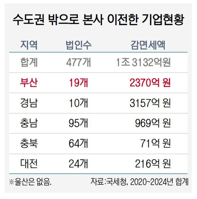 1일 국회 더불어민주당 조승래 의원이 국세청으로부터 받은 자료에 따르면, 2020년부터 2024년까지 본사를 지방으로 이전한 기업은 477개며 이를 통해 감면받은 법인세는 1조 3132억원이었다.