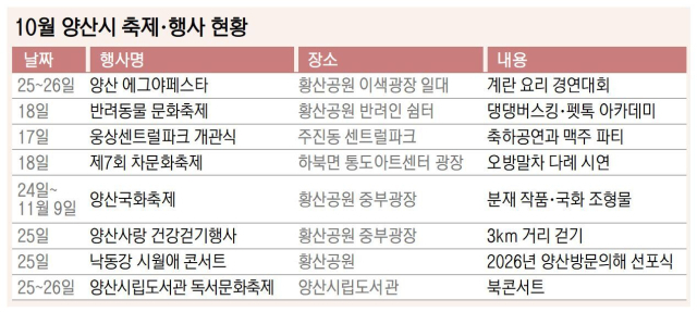 이밖에 18일에는 하북면 통도아트센터 광장에서 ‘제7회 양산차문화축제’를 비롯해 25·26일 양일간 양산시립중앙도서관에서 ‘2025년 양산시립도서관 독서문화축제’도 열린다.