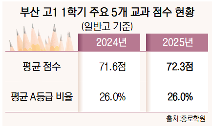 올해부터 고등학교 1학년에 적용된 ‘내신 5등급제’가 첫 학기를 마치면서, 전국적으로 주요 5개 과목의 평균 점수와 절대평가 기준 최고 등급인 ‘A등급’ 비율이 모두 상승한 것으로 나타났다. 등급 구간이 넓어지고 실제 원점수도 오른 만큼 변별력 약화 우려가 제기된다. 하지만 내신 성적이 5학기 동안 누적 반영되는 구조인 만큼, 장기적으로는 일정 수준의 변별력이 유지될 것이라는 교육 당국의 전망도 함께 나온다.