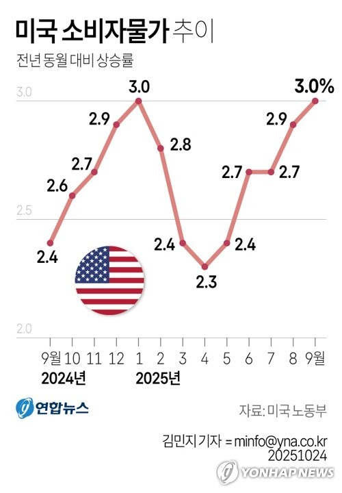9월 미국의 소비자물가 상승률이 3.0%로 나왔다. 관세부과의 영향으로 8월의 상승률 2.9%보다 소폭 올랐다.