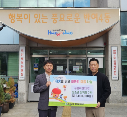 푸른이앤지(주)(대표 강병주)는 지난 24일 해운대구 반여4동 행정복지센터(동장 김기환)에 장학금 3백만 원을 기탁했다고 밝혔다.