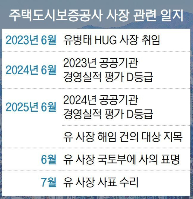 HUG는 그동안 전임 사장이 중도에 하차하면서 CEO 공백 상태를 이어왔다. 유병태 전 사장은 2023년 6월 취임한 뒤 2년 만인 지난 6월 말 국토부에 사의를 표명했고 다음 달인 7월에 사표가 수리됐다. 유 전 사장은 사의 표명 전 공공기관 평가에서 2년 연속 미흡(D) 등급을 받아 국토부로부터 해임 건의 대상에 오르기도 했다.