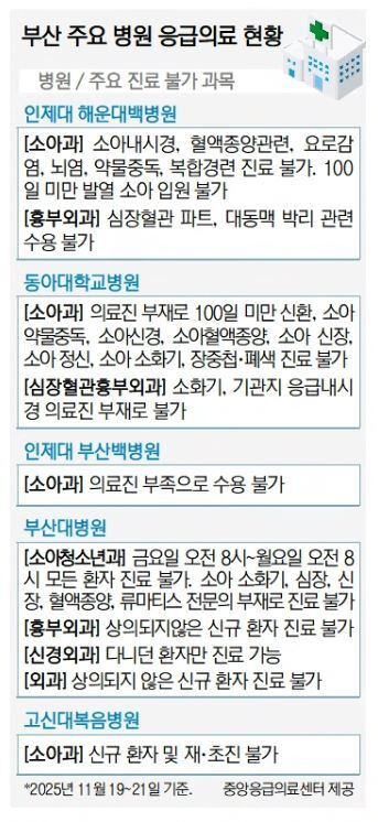 지난 9월 전공의들이 복귀하며 의정 갈등이 봉합됐지만 부산 주요 병원 응급실은 여전히 의료진 부족으로 소아과와 외과 등 일부 과목이 마비 상태인 것으로 나타났다. 소아과의 경우 모든 분야의 소아 응급환자 진료가 가능한 병원이 전무해 지역 응급의료 체계 붕괴가 현재진행형이라는 지적이 나온다.
