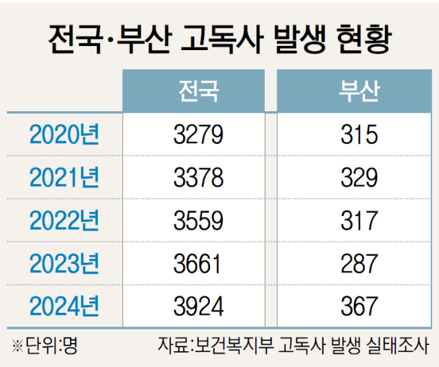 조사 결과 지난해 부산에서는 고독사 사망자가 367명 발생했다. 2023년 287명에서 80명이 늘었다. 최근 5년간 발생 중 가장 많았다.