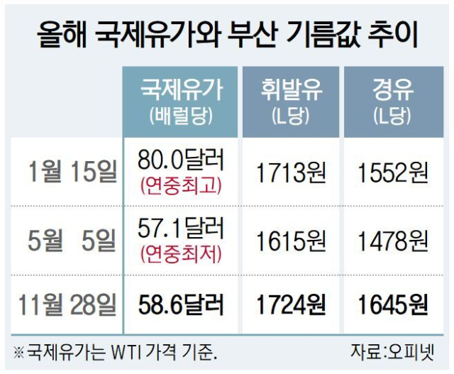 하지만 이와 반대로, 부산 휘발유 가격은 1일 기준 L당 1725원으로 올해 1월 23일 기록했던 연중 최고가격 1730원에 근접했다. 국제유가와 국내 기름값이 반대방향으로 움직이는 이례적 현상인 것이다. 부산 경유 가격은 1645원으로 지금이 연중 최고치다.