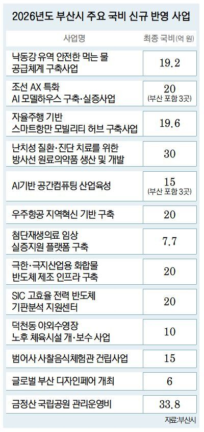 정부안에는 삭감됐다가 국회에서 회생한 사업에는 바이오·인공지능(AI)·해양 등 미래 신성장 산업을 키우기 위한 신규 사업들이 다수 포함됐다. 해양·항만 분야의 조선 AX 특화 AI 모델하우스 구축(20억 원, 부산 포함 3곳), 자율주행 기반 스마트항만 모빌리티 허브 구축(19억 6000만 원), 바이오 분야의 난치성 질환·진단 치료를 위한 방사선 원료의약품 생산 및 개발(30억 원), 첨단재생의료 임상 실증지원 플랫폼 구축(7억 6600만 원), 전력반도체 분야의 극한·극지산업용 화합물 반도체 제조 인프라 구축(20억 원), SIC 고효율 전력 반도체 기판 분석 지원센터 구축(20억 원), 그 외 우주항공 지역 혁신 기반 구축(20억 원) 등이 모두 전액 신규로 반영됐다.