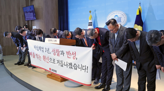 12·3 비상계엄 사태 1년인 3일 이성권, 김용태 등 국민의힘 초재선을 주축으로 한 의원 25명이 서울 여의도 국회 소통관에서 비상계엄 관련 입장 발표 기자회견을 열고 허리 숙여 사과하고 있다. 연합뉴스