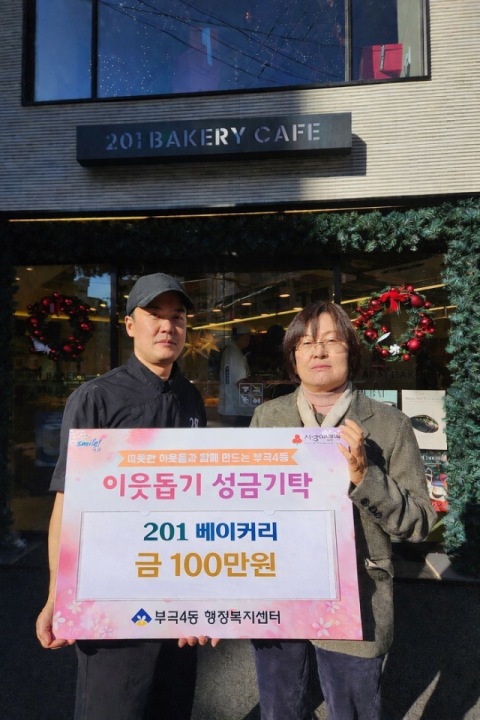 부산 금정구 부곡4동 행정복지센터는 201 베이커리(대표: 이영일)에서 지난해 12월 26일 이웃돕기 성금 100만 원을 기탁했다고 밝혔다.