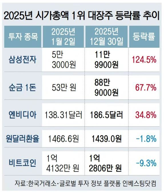 11일 한국거래소와 글로벌 투자 정보 플랫폼 인베스팅닷컴에 따르면 지난해 자산별 시가총액 1위 기준 상승률이 가장 높았던 투자 종목은 삼성전자(124.5%)다. 대장주 종목별로는 삼성전자에 이어 △금(67.7%) △엔비디아(34.8%) △원달러 환율(-1.8%) △비트코인(-9.3%) 순이었다.