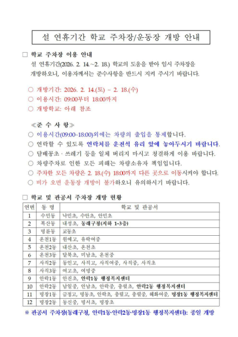 연휴 기간 동안 관공서 주차장은 종일 개방되며, 학교 주차장은 오전 9시부터 오후 6시까지 이용할 수 있다. 다만, 우천 시 운동장은 개방하지 않는다.