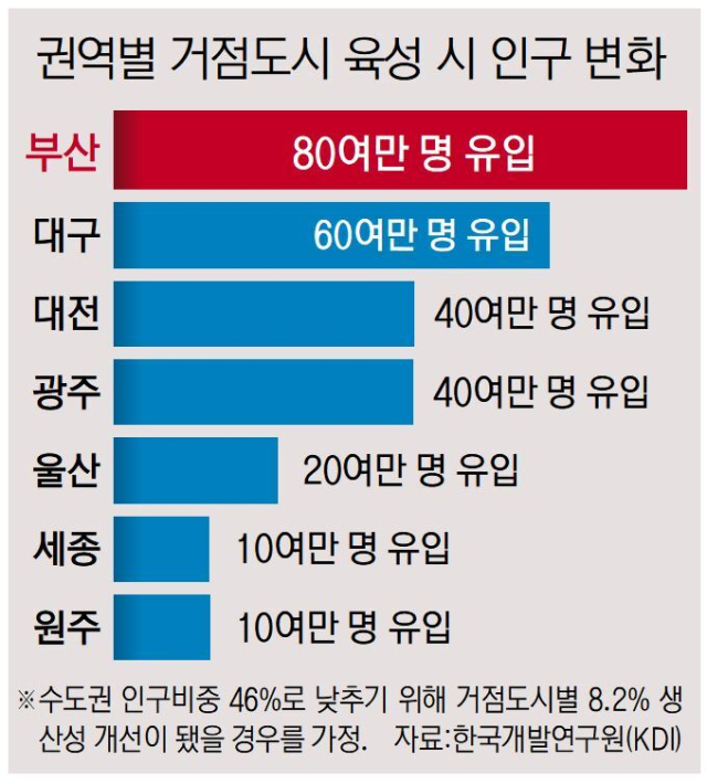 국가균형발전의 목표가 수도권과 비수도권 격차 완화라면, 비수도권 내의 격차 확대는 일정 정도 용인해야 하며 소수도시에 자원을 집중하는 접근이 필요하다는 국책연구기관의 제언이 나왔다. 특히 권역별 거점도시 생산성을 높였을 경우, 가장 인구 유입이 많은 부산을 비롯해 대구 대전 광주 울산에 역량을 쏟아부을 필요가 있다는 것이다.