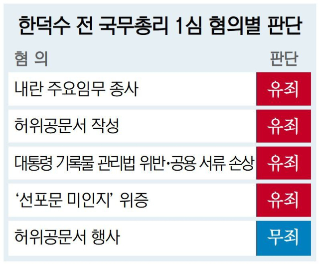 재판부는 ‘국정 2인자’였던 한 전 총리 지위와 책임을 고려하면 엄벌이 불가피하다고 판단했다. 재판부는 “국무총리는 헌법을 수호하고 실현하기 위한 모든 노력을 기울여야 할 의무를 부담한다”며 “12·3 내란이 성공할 지도 모른다는 생각에 의무와 책임을 끝내 외면하고, 그 일원으로 가담하기로 선택했다”고 질책했다.