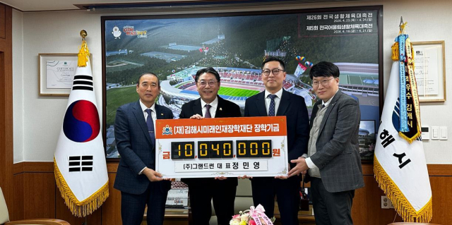(주)그랜드썬은 지난 14일 김해시청에서 열린 김해시미래인재장학재단 장학기금 기탁식을 통해 장학금 1004만 원을 기탁했다. 이번 기탁은 김해 지역 인재 육성과 교육 지원을 위한 기업의 사회공헌활동으로 지역사회와의 상생 행보를 보여준 사례로 꼽힌다.