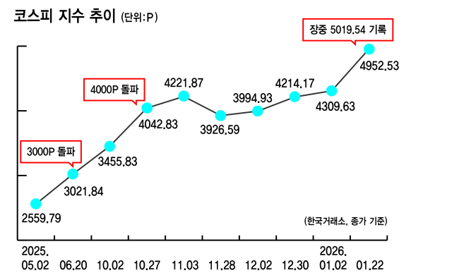22일 한국거래소에 따르면 코스피는 이날 개장 직후 5000포인트를 돌파하는 데 성공했다. 코스피는 장중 5019.54까지 오르기도 했다.