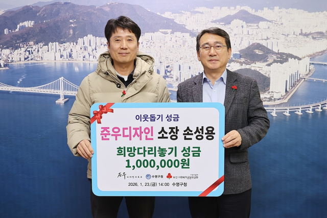 부산 수영구(구청장 강성태)는 지난 23일 구청장실에서 준우디자인(소장 손성용)으로부터 저소득층 이웃돕기 희망다리놓기 성금으로100만 원을 전달받았다.