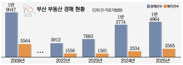 27일 법원 등기정보광장에 따르면 지난해 1~12월 부산의 경매 건수는 1만 4964건으로 전년(1만 3774건) 대비 8.6% 증가했다. 이는 글로벌 금융위기로 경매가 쏟아졌다고 평가 받는 2009년(1만 9047건) 이후 16년 만에 가장 높은 수치다.