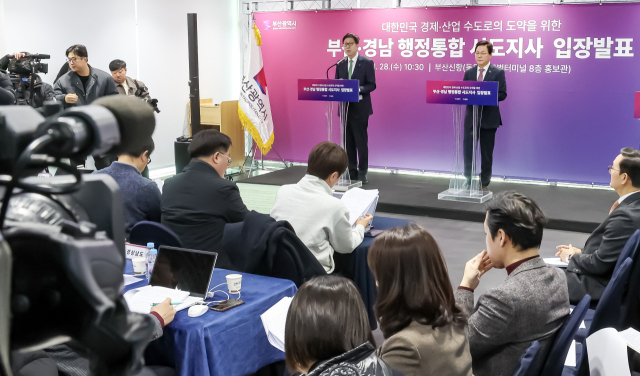 박형준 부산시장과 박완수 경남도지사가 지난 28일 부산·경남 행정통합 공동 입장문을 발표하고 있다(위). 지방분권균형발전부산시민연대가 지난 27일 행정통합 추진 방향을 제안하는 기자회견을 하고 있다. 이재찬·김종진 기자 chan@ 박형준 부산시장과 박완수 경남도지사가 지난 28일 부산·경남 행정통합 공동 입장문을 발표하고 있다(위). 지방분권균형발전부산시민연대가 지난 27일 행정통합 추진 방향을 제안하는 기자회견을 하고 있다. 이재찬·김종진 기자 chan@