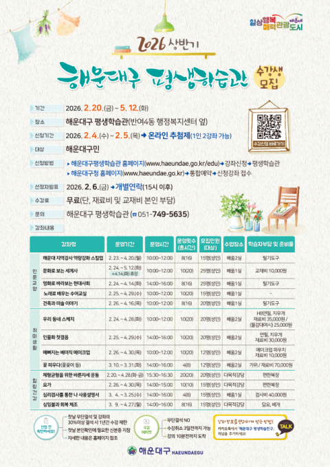 해운대구(구청장 김성수)는 지역 주민의 평생학습 참여 확대를 위해 2026년 평생학습관 상반기 프로그램 수강생을 모집한다고 밝혔다.