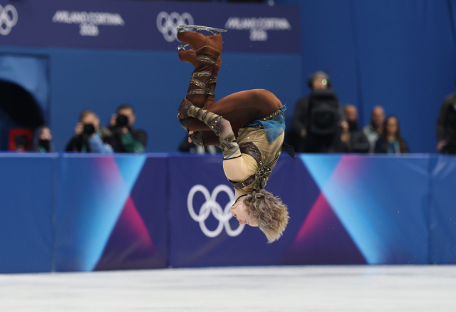 7일(현지 시간) 2026 밀라노-코르티나담페초 동계올림픽 피겨스케이팅 팀 이벤트 남자 싱글 쇼트 프로그램에서 미국 일리야 말리닌이 백플립(뒤 공중제비) 연기를 펼치고 있다. 연합뉴스