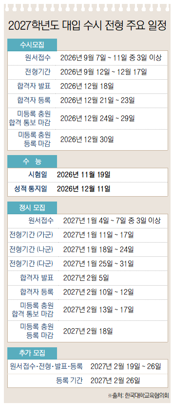 오는 3월 새학기를 맞는 고3은 2027학년도 대입을 향한 본격적인 준비에 들어간다. 2027학년도 대입 전체 모집인원은 34만 5717명으로, 수시모집이 27만 7583명(80.3%), 정시모집이 6만 8134명(19.7%)이다. 일정은 전년도와 큰 틀에서 비슷하지만, 정시 미등록 충원 등록 마감 시한과 추가모집 지원 방식 등 일부 절차에는 변화가 있다. 한국대학교육협의회가 발간한 ‘2027학년도 대입정보 119’를 토대로 고3이 반드시 짚어야 할 2027학년도 대입 주요 특징을 정리했다.