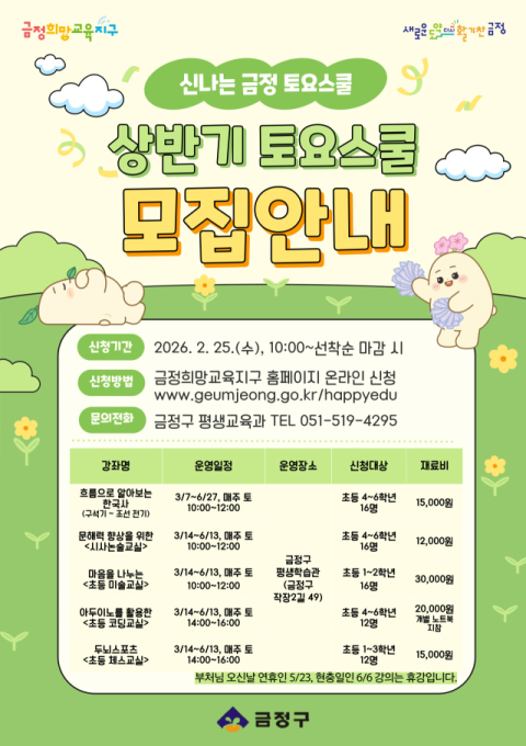 부산 금정구(구청장 윤일현)는 보호자(학부모 등)의 사교육비 부담을 줄이고 창의적인 미래 인재를 양성하기 위해 매주 토요일 관내 초등학생을 대상으로 ‘2026 상반기 금정 토요스쿨’ 프로그램을 운영한다고 전했다.