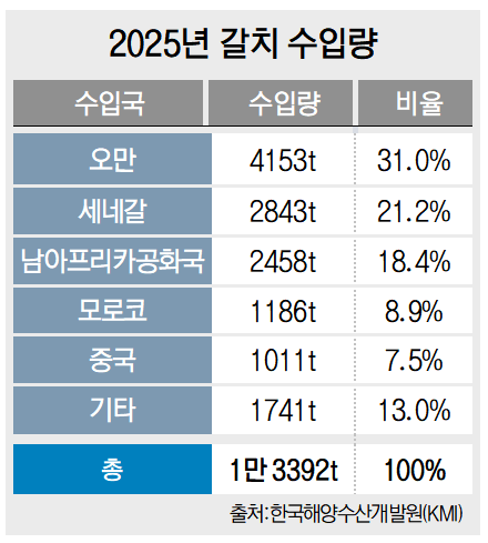 11일 한국해양수산개발원(KMI)에 따르면, 지난해 갈치 수입량은 1만 3392t으로 이 중 오만산 갈치는 4153t을 차지했다. 수입산 갈치 중에서 가장 높은 비율(31%)이다.