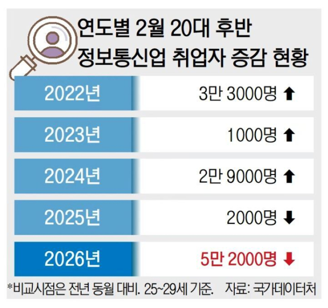 지난달 20대 후반 정보통신업 취업자는 전년 대비 5만 2000명 줄었다. 지난해 2월에 전년 대비 2000명 감소한데 이어 2년째다. 전문·과학 및 기술 서비스업 역시 2만 9000명 감소했다. 이 역시 작년(-2만 명)에 이어 2년 연속 감소세다.