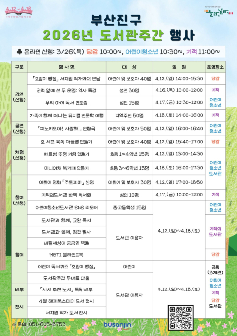 행사 참여는 온라인 신청 및 현장 참여로 가능하며, 사전 온라인 신청이 필요한 프로그램은 3월 26일부터 부산진구 통합도서관 홈페이지에서 도서관별로 순차 접수할 예정이다.