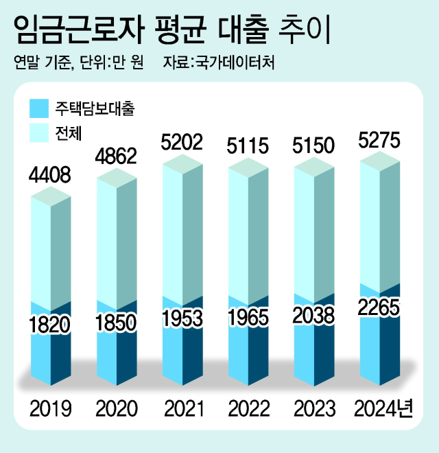 데이터처는 임금근로자가 은행과 비은행 금융기관에서 빌린 개인대출 잔액을 조사했다. 2024년 12월 말 기준 임금근로자의 평균 대출 잔액은 평균 5275만 원으로, 전년보다 2.4%(125만 원) 늘어났다. 2022년 이후 2년째 상승세로, 1년 전(0.7%)보다 상승 폭을 더 키웠다.