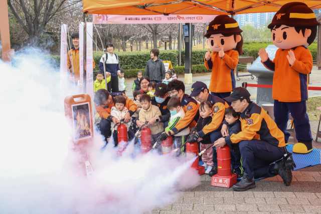 부산119안전체험관은 25일 오전 부산 시민공원 기후위기시계 앞 광장에서 봄철 맞춤형 찾아가는 안전 체험교육 일환으로 ‘봄날의 안전 산책, 119 안전 체험’ 행사를 열었다. 체험에 참여한 어린이들이 소화기 작동법을 배우고 있다.