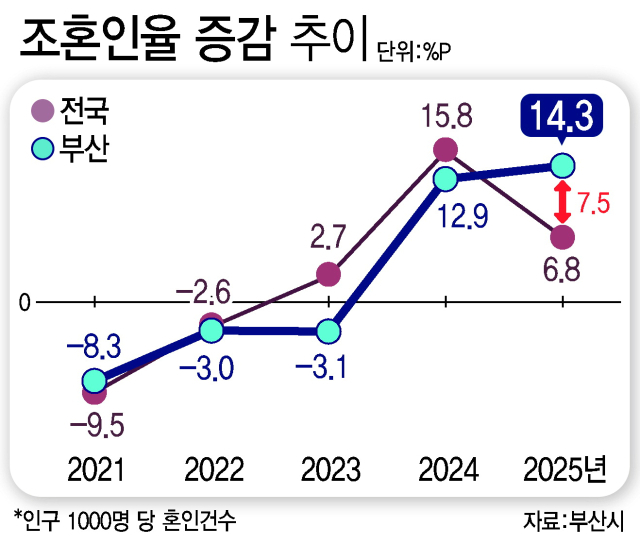 청년 고용 증가와 일자리 미스매치 해소는 후발 지표에도 긍정적인 영향을 불어넣고 있다. 고용이 안정되자 결혼과 출산 등 부산에서 가정을 꾸리는 청년이 늘어나기 시작한 것이다. 결혼과 출산 관련 지표가 가파른 상승세를 보인다.