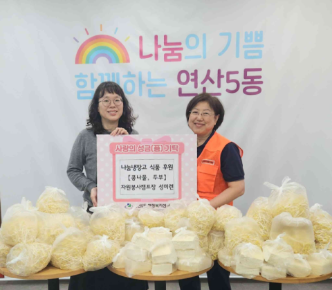 부산 연제구 연산5동(동장 노윤경)은 지난 24일 자원봉사캠프(캠프장 성미련)에서 동 행정복지센터 내 비치된 행복연제 나눔냉장고에 콩나물 10kg와 두부 12kg (10만원 상당)을 기탁했다고 전했다.