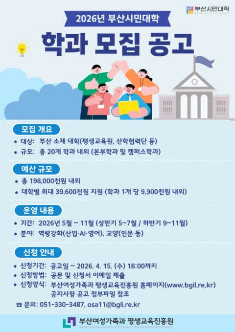 (재)부산여성가족과 평생교육진흥원(이하 여평원)은 부산 시민의 역량 강화와 자아실현을 위해 「2026년 부산시민대학」을 운영하고, 이를 위한 학과를 공모한다고 밝혔다.