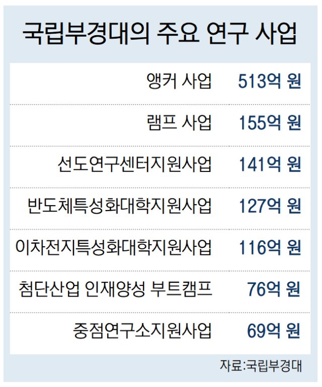국립부경대학교는 첨단 분야 연구를 위해 정부의 대형 국책 사업을 잇따라 따내며 든든한 연구 인프라를 구축하고 있다. 2025년부터 시작되는 앵커(구 RISE) 사업에 총 513억 원을 확보한 것을 비롯해, 램프(LAMP) 사업 155억 원, 선도연구센터지원사업 141억 원, 반도체 특성화 대학 지원 사업 127억 원, 이차전지 특성화 대학 지원 사업 116억 원 등 주요 사업의 총사업비 규모가 상당하다. 특히 과기부의 이공계 연구 생활장려금 지원사업(17억 원) 등을 통해 연구 인력 양성에도 박차를 가하고 있다.