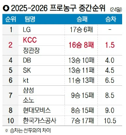 KCC는 지난 24일 부산 사직체육관에서 열린 서울 삼성과의 2025-2026 프로농구 홈 경기에서 98-91로 승리했다. 16승 8패를 기록한 KCC는 안양 정관장과 함께 공동 2위에 올랐다. 1위 창원 LG에 1.5 경기 차로 바짝 추격하고 있다.