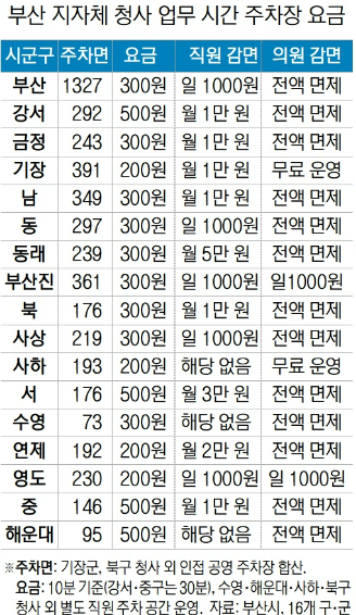 반면 지자체 직원과 기초의원들은 청사 주차 요금이 감면된다. 대부분 지자체는 직원들이 청사 주차장을 하루 1000원 혹은 월 1만~5만 원에 이용할 수 있다. 사하구와 수영구, 해운대구에는 직원 주차 요금을 감면하는 제도가 없지만 청사 외 별도 공간을 직원들의 주차 공간으로 운영하고 있다. 수영구청 관계자는 “청사 내 주차 공간이 부족한 탓에 민원인과 직원 모두의 주차를 최대한 보장하기 위한 것”이라고 말했다.