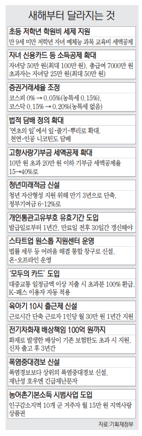 내년부터 초등학교 저학년(만 9세 미만) 자녀의 예체능 학원비도 교육비 세액공제를 받을 수 있다. 청년 자산 형성을 지원하기 위해 만기를 3년으로 줄이고 정부기여금 지원 비율을 올린 ‘청년미래적금’이 6월 출시된다. 정부가 금융투자소득세(금투세) 폐지에 따라 인하했던 증권거래세를 종전 수준으로 올린다. 2026년 최저임금은 시간당 1만 320원으로 오른다. 전기차 화재로 큰 피해가 나서 자신의 보험으로는 감당할 수 없을 때, 100억 원까지 피해보상을 해 준다.