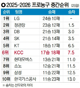 KCC는 25일 부산 사직실내체육관에서 열린 2025-2026 LG전자 프로농구 서울 SK와의 경기에서 72-102로 대패했다. 17승 18패로 5할 승률 아래로 처진 KCC는 플레이오프 진출 마지노선인 6위로 처졌다.