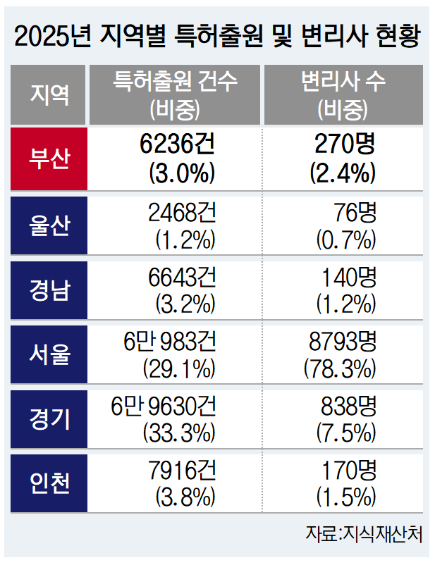 지난해 부산의 특허 출원 건수는 6236건으로 집계됐다. 전국 출원량의 고작 3% 수준이다. 서울(29.1%)과 경기(33.3%)가 전체의 60% 이상을 독식하고, 지식재산처가 위치한 대전(5.6%)에도 뒤처지는 뼈아픈 수치다.