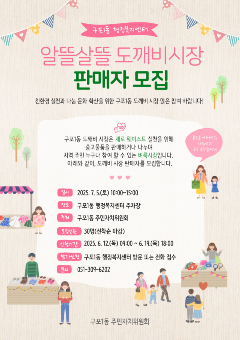 판매자 모집 기간은 6월 12일 오전 9시부터 19일 오후 6시까지이며, 구포1동 행정복지센터로 방문하거나 전화로 신청하면 된다. 선정 결과는 20일 개별 통지된다.