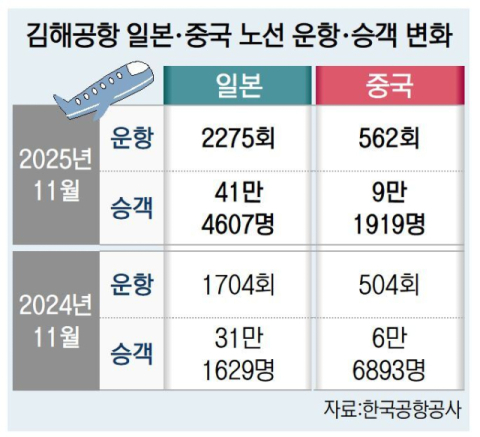 김해공항의 중국 노선 승객 규모와 관련해선 운항 부족이 원인이라는 지적이 나온다. 인천공항의 경우 지난달 중국 노선 운항 횟수가 7472회로 일본 노선(8337회)의 90%에 달한다. 반면 김해공항은 지난달 562회로 일본 노선(2275회)의 25%에 불과하다. 김해공항 국제선 수요가 일본 노선에 특화된 사실을 감안하더라도 중국 노선 운항이 상대적으로 부족하다.