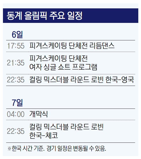 컬링에 이어 6일엔 ‘피겨 여왕’ 김연아 이후 12년 만에 동계 올림픽 입상에 도전하는 한국 피겨 스케이팅이 단체전인 팀 이벤트 아이스댄스 리듬댄스와 여자 싱글 쇼트 프로그램으로 대회에 나선다.