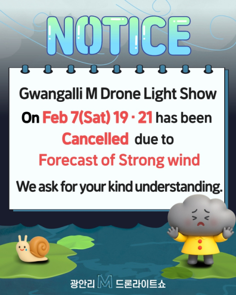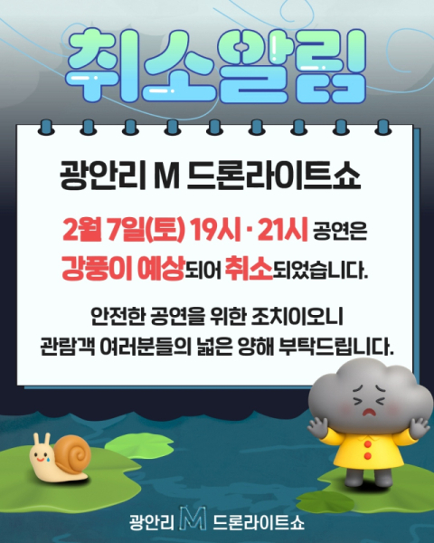 수영구는 “이번 주 공연은 악천후로 인해 부득이하게 취소돼 관람을 기대하신 시민 여러분께 깊은 양해를 부탁드린다”며 “드론쇼는 공연 하루 전 기상 예보를 기준으로 판단하되, 당일에도 현장 기상 여건에 따라 취소될 수 있으므로 공연 일정 변경이나 취소 여부는 공식 홈페이지와 SNS 채널을 통해 관람 전 확인을 당부드린다”고 전했다.